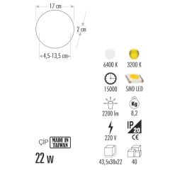 Lümen Verimliliği:100 lm / W - 95.45 lm / WÜrün Ömrü (Anma):15.000 saIşık Açısı:120 °Işık Akısı (Nominal):2200 lm -2100 lmN.K.Ö.S.L.Süreklilik Faktörü:% 70Nominal Güç:22 WBeyan Akımı:300 mAÇalışma Sıcaklığı:20°C ~60°CDim Özelliği:Dim EdilemezÜrün Ömrü (Nominal):15.000 saKoruma Sınıfı:IP 20Renk Sıcaklığı:6000 K - 3000 KIşık Akısı (Anma):2200 lm -2100 lmRenksel Geriverim İndeksi:80Frekans:50-60 HzAnma Gücü:22 WGüç Faktörü (Nominal):0.5Ürün Ölçüleri:170 x 27 mmCıva Miktarı:Cıva İçermez