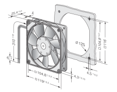 Kütle: 175 gr. Kütle: 0,175 kg Boyutlar :119 x 119 x 25 mm Çark Fiberglas takviyeli PA plastik malzeme Gövde malzemesi Fiberglas takviyeli PBT plastik Bar üzerinde hava akımı Hava çıkış yönü Dönüş yönü rotor bakarak, Sol Rulmanlar Rulman ° C 60000 saat 40 Ömür Boyu L10 Maksimum sıcaklık 37500 h ömrü L10 Bağlantı hattı Tek teller AWG 24, TR 64, çıplak ve kalay kaplı. Motor koruma ters ve kilitleme karşı korumalı. Kilitli-rotor koruması Engelleme ve aşırı yük koruması Onay: VDE, CSA, UL, CE